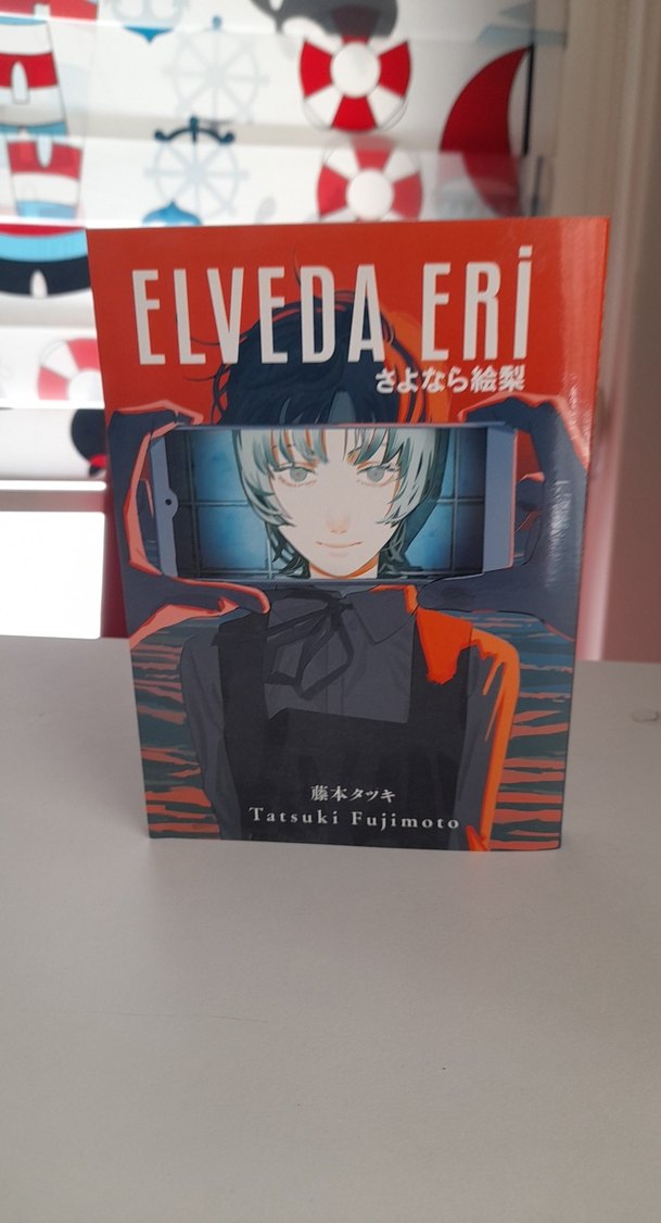 Tatsuki Fujimoto'nun 'Elveda Eri' adlı çizgi romanı, karakterin telefon ekranıyla gizlendiği dikkat çekici kapak tasarımıyla sunuluyor. genellikle temizdir arkada çektiğim gibi minik bir kusuru vardır