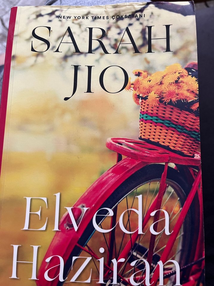 Sarah Jio'nun 'Elveda Haziran' adlı romanı, üzerinde turuncu çiçekler taşıyan kırmızı bir bisikletin olduğu nostaljik bir kapak tasarımına sahip.
