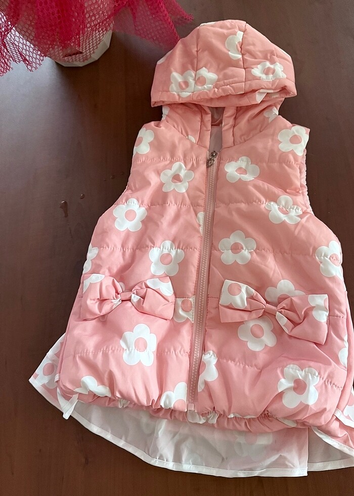 Soft pembe kuyruklu kapşonlu elyaf dolgulu yelek somon renk 6-8 yaş