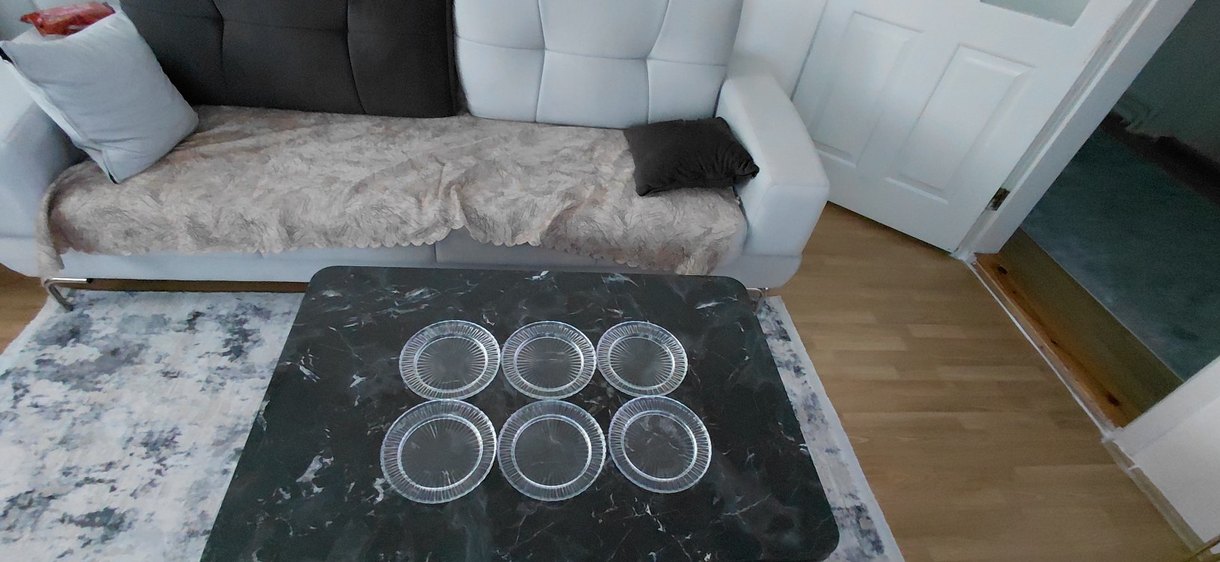 Altı adet siyah, desensiz cam tabak seti. Her tabakta "DOO" işaretlemesi bulunur. Minimalist sofralar için uygundur. ️6 lı pasta setidir.