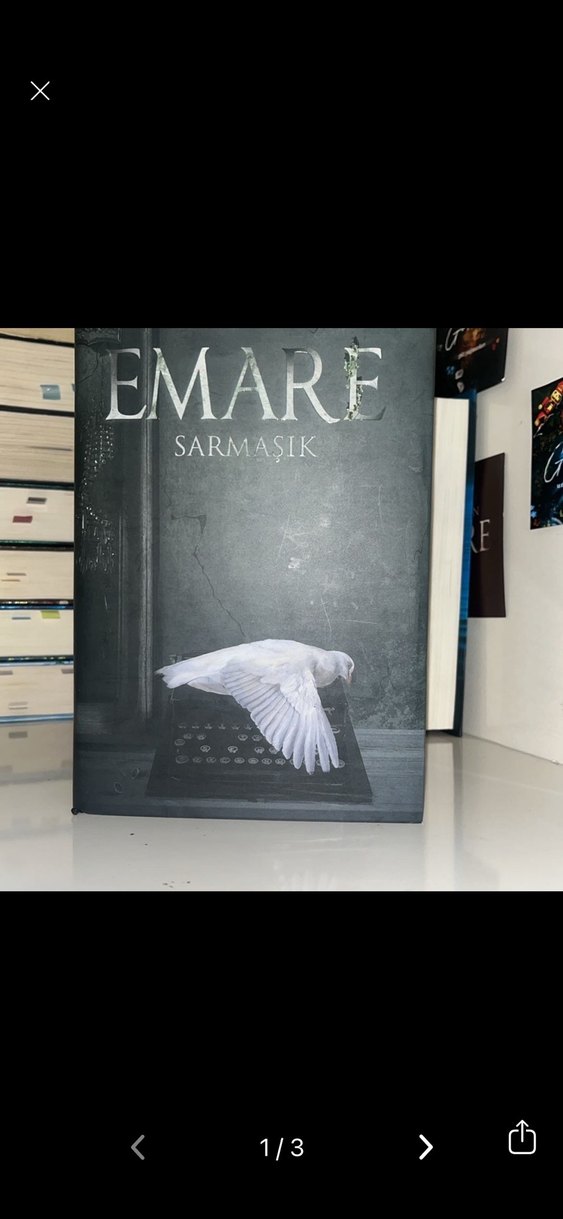 Emare adlı roman, Sarmaşık ismiyle yayımlanmış, kapağında beyaz bir güvercin resmi bulunan koyu renkli bir kitap.