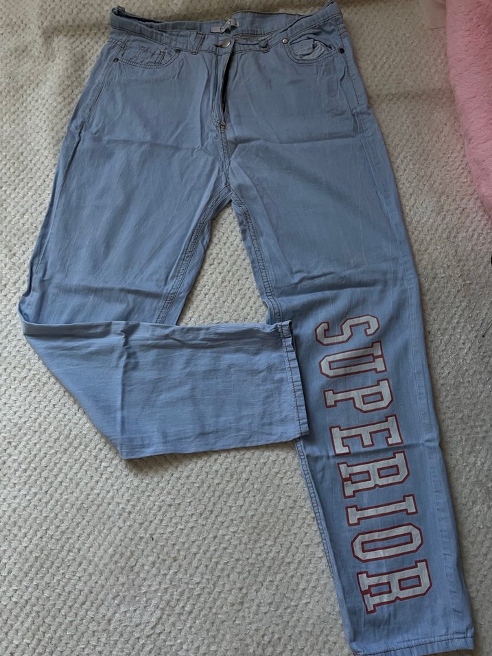 Mavi renkli, bol kesim denim kot pantolon, fermuarlı detay ve bacakta 'SUPERIOR' baskısı ile spor ve günlük kullanıma uygun. 2-3 kez ancak giyilmiştir