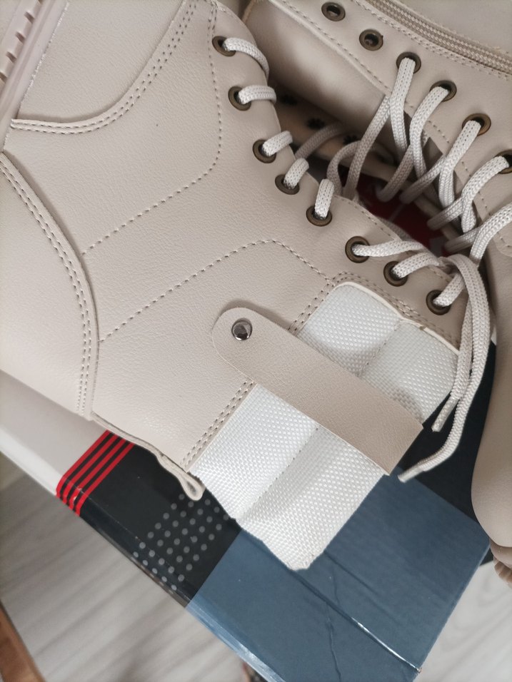 Gri ve beyaz renklerde, blok topuklu, cırt cırt bantlı, kauçuk malzemeden günlük rahat kullanım için kadın botu.