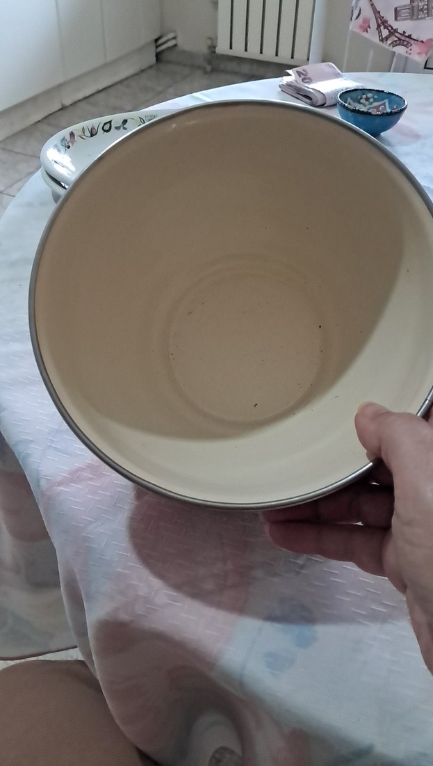 Pürüzsüz iç yüzeye sahip bej renkli derin tencere, çeşitli yemekler için uygundur. Gri kenarlığı 12 cm derinlik 20 cm cap