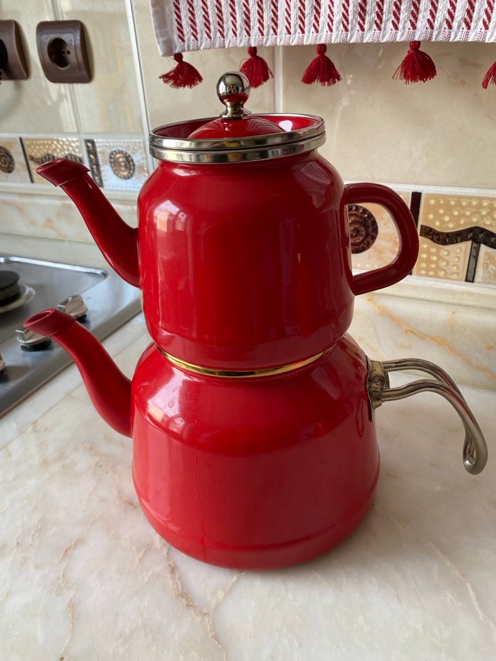 Parlak kırmızı renkte, metal saplı ve kapaklı çift katmanlı klasik tasarım çaydanlık.