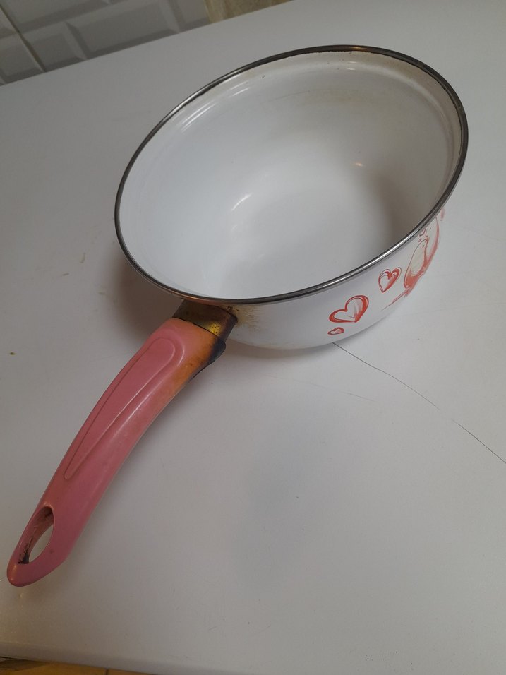 Pastel pembe saplı, üzerinde kalp desenleri bulunan beyaz sos tenceresi. İç yüzeyi düzgün ve sos pişirmeye uygundur.