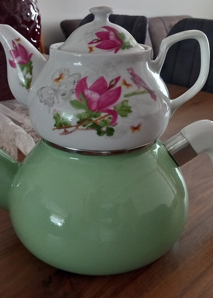 Emaye porselen çaydanlık ikikez kullanıldı yeniden farksız hiçbir deformasyonu yoktur çok şık bir üründür temiz.