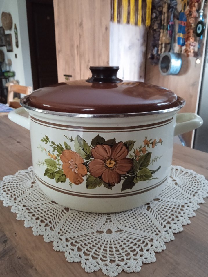 İçi ve kapağı kahverengi büyük bir tencere. İçinde, muhtemel üretim kaynaklı,minik iki leke var.Atık değil. Boya. Dış yüzeyde kullanılan krem boya gibi. Fotoğraflarda görebilirsiniz. Ayrıca o lekelerin hemen altında bir kusuru daha var. Onu da çekmeye çalıştım. Ben emaye parçaları çok sevdiğim için dekorasyon amaçlı kullandım. Ama ben almadan önce kullanılmış bir tencere.Kapaklı yüksekliği 19 cm, kapaksız 15 cm, çapı 25.5 cm.