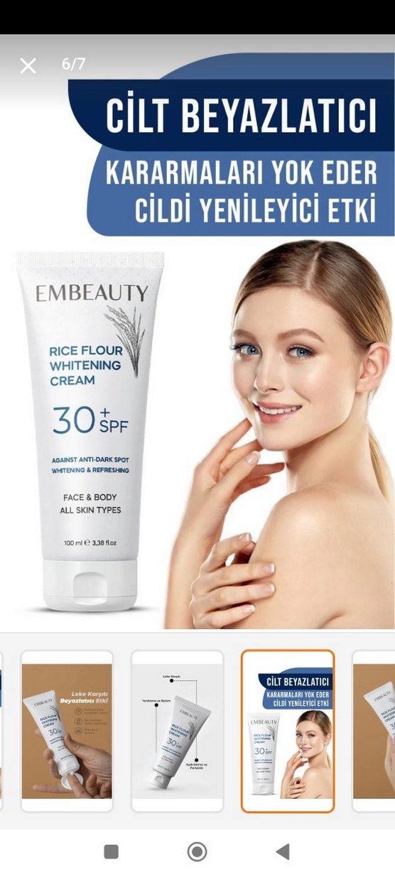Embeauty pirinç unlu beyazlatıcı krem SPF30 koruması ile cilt yenileyici ve kararma karşıtı etki sağlar. Tüm cilt tipleri için yüz ve vücutta kullanılır.