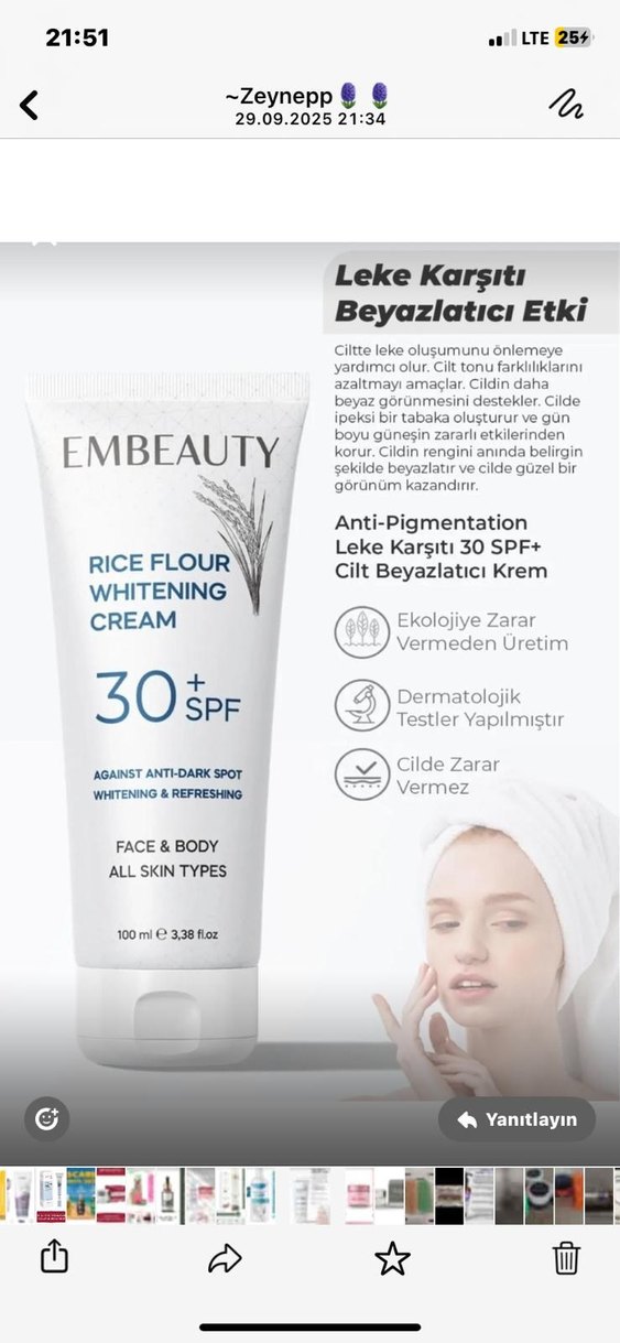 Embeauty Pirinç Unlu Beyazlatıcı Krem SPF30, leke karşıtı ve cilt tonunu açıcı etkiler sunar. Güneşin zararlı etkilerinden korur, ciltteki koyu lekeleri azaltır. Yüz ve vücut için uygundur. Sıfırdır hiç kullanılmadı