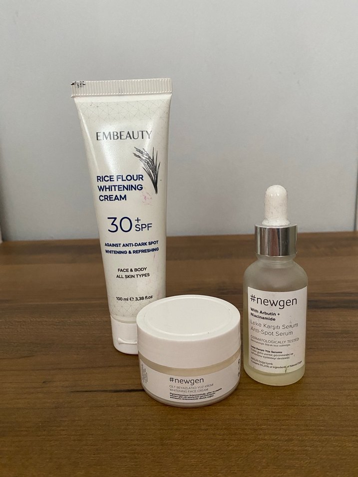Embeauty Pirinç Unu Beyazlatıcı Krem, SPF 30 koruma sağlar ve koyu lekeleri hedefler. Yüz ve vücut için tüm cilt tiplerine uygundur. #newgen serumu leke karşıtı destek sunar. Embeauty hiç kullanılmadı. Diğer serum ve krem sadece 1 kere kullıldı
