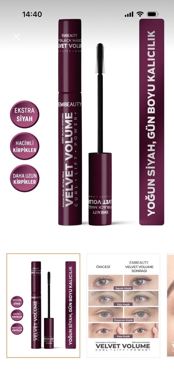 Embeauty Velvet Volume bordo maskara, ekstra siyah, hacimli ve daha uzun kirpikler sağlar, kıvırma etkisiyle.