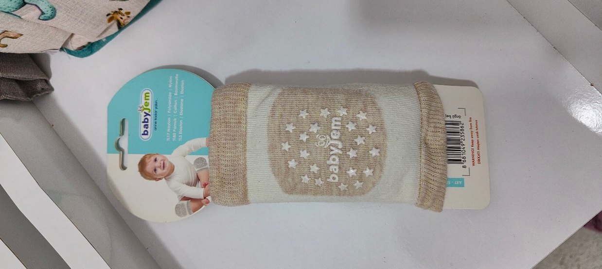 Yumuşak pamuklu kumaştan üretilmiş, bej renkli, pastel tonlarda yıldız desenli ve ortasında 'babyjem' yazısı bulunan bebek emekleme aksesuarı.