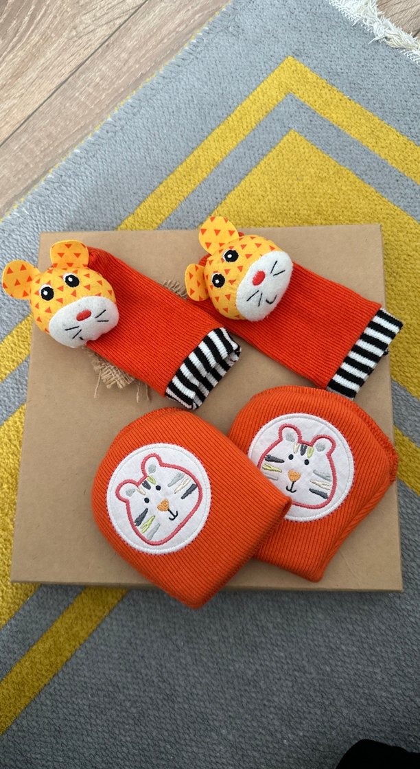 İkisi 100₺ Turuncu ve çok renkli, kaplan figürlü iki pati kılıfı ve iki çoraptan oluşan kedi aksesuarları seti.