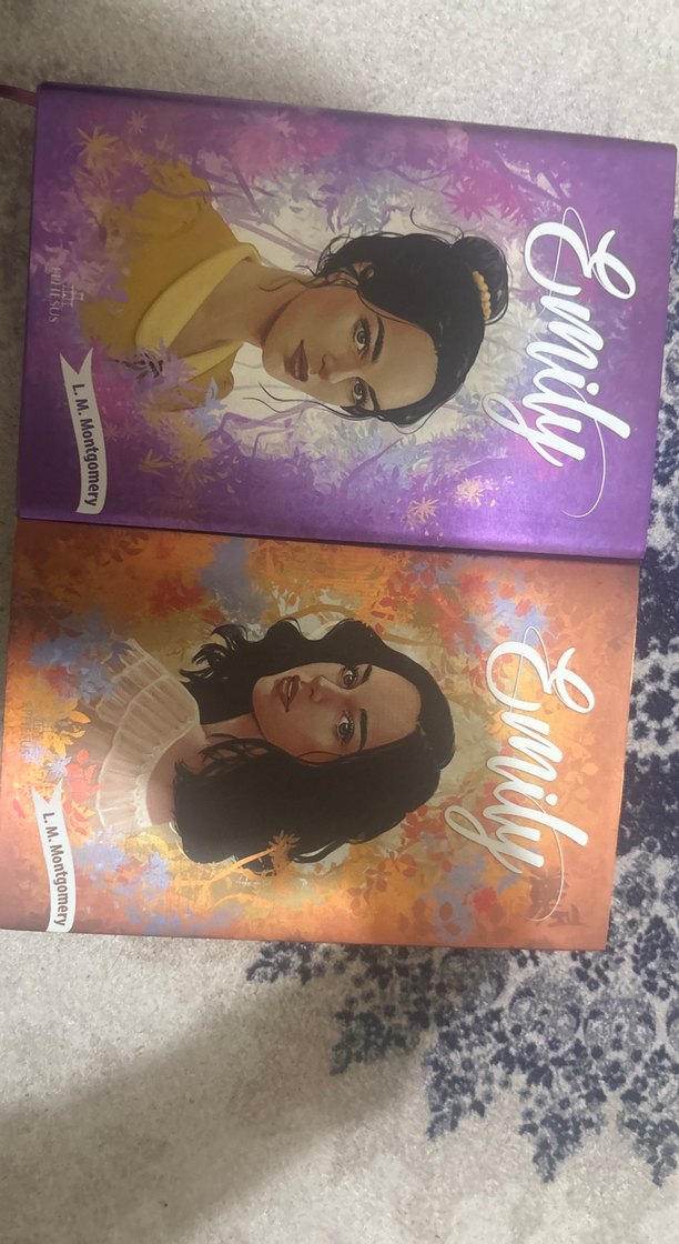 L. M. Montgomery imzalı "Emily" adlı iki roman seti, canlı renklerde kadın portreleriyle kaplı. 2. Turıncu 3.Mor ikisi