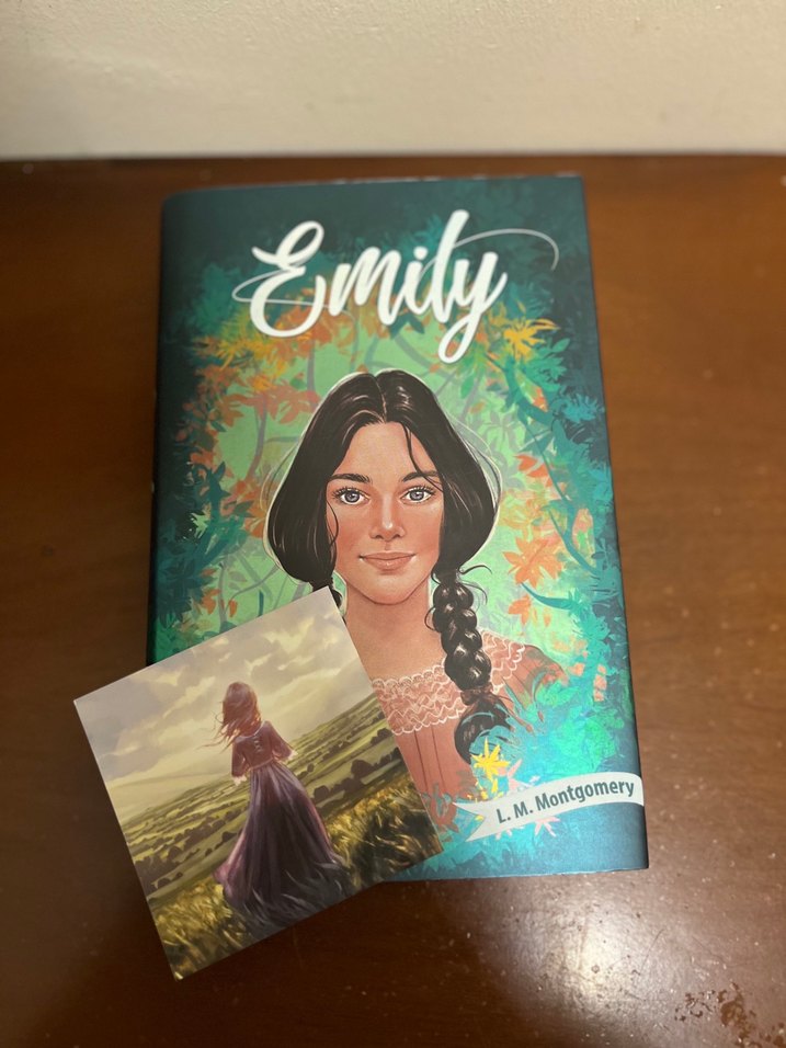 L. M. Montgomery'nin "Emily" romanı, örgülü saçlı genç bir kadının portresi ve renkli yapraklarla çevrili güzel bir kapak tasarımına sahiptir.