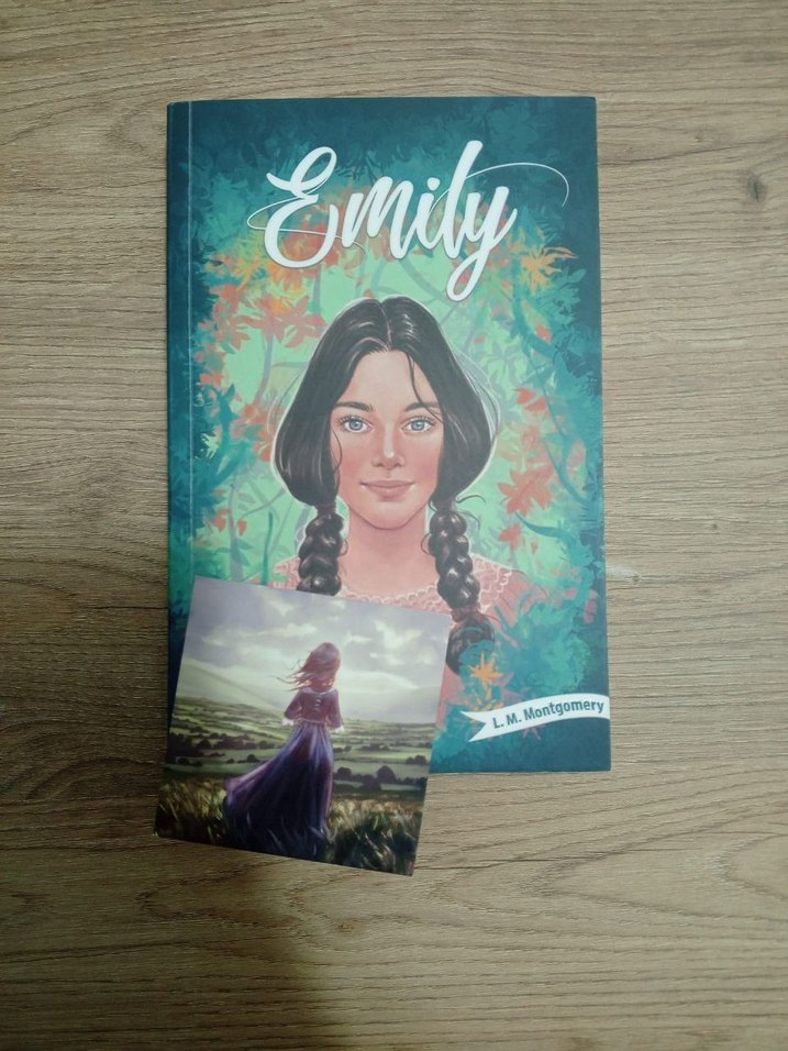 L. M. Montgomery tarafından yazılan 'Emily' romanı, örgülü saçlı genç bir kızın yer aldığı renkli yapraklı bir arka planı gösteren kapak tasarımına sahiptir. Yanında mor elbiseli bir kadının tarlada durduğu bir fotoğraf vardır. Yeni hasarsız eksiksiz kitap.