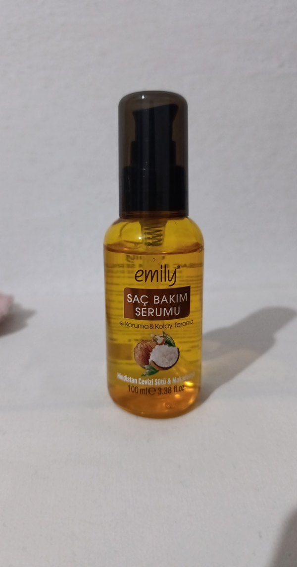 Emily saç bakım serumu, Hindistan cevizi sütü ve ceviz özü içerir. Saçı korur ve kolay tarama sağlar. 100 ml. yeni ürün , çok az kullanıldı .fazlalık olduğu için satiyorum