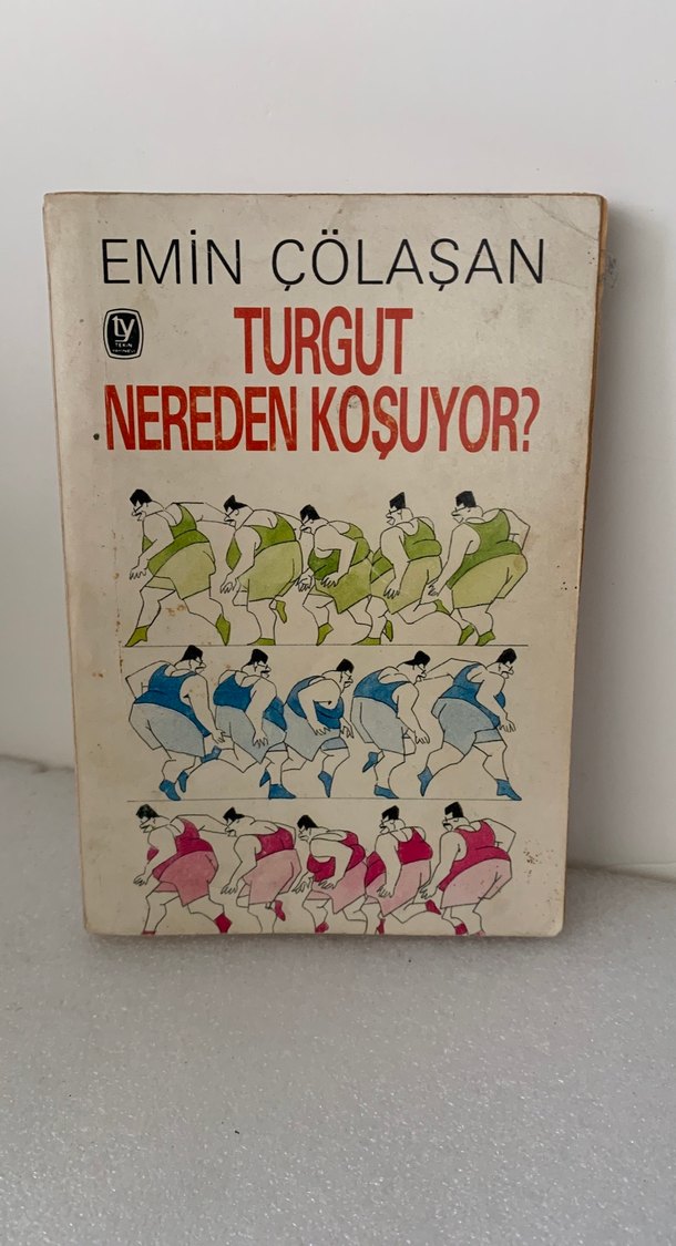 Emin Çölaşan'ın "Turgut Nereden Koşuyor?" adlı mizah kitabı, farklı renklerde koşan figürlerin yer aldığı eğlenceli bir kapak tasarımına sahiptir.