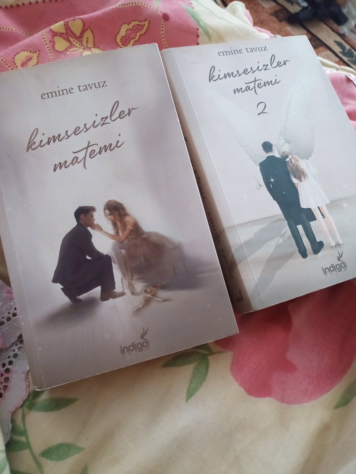 Emine Tavuz'un Indigo yayınevinden çıkan 'Kimsesizler Matemi' ve devamı 'Kimsesizler Matemi 2' adlı iki romanı. Kapaklarda duygusal sahneler yer alıyor.