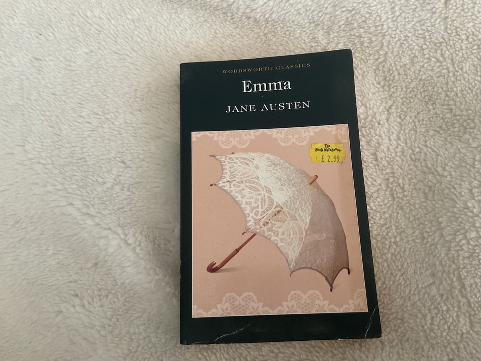 Emma, Jane Austen tarafından yazılmış klasik bir romandır. Kapağında dantel şemsiye resmi vardır. İngilizce basımdır.