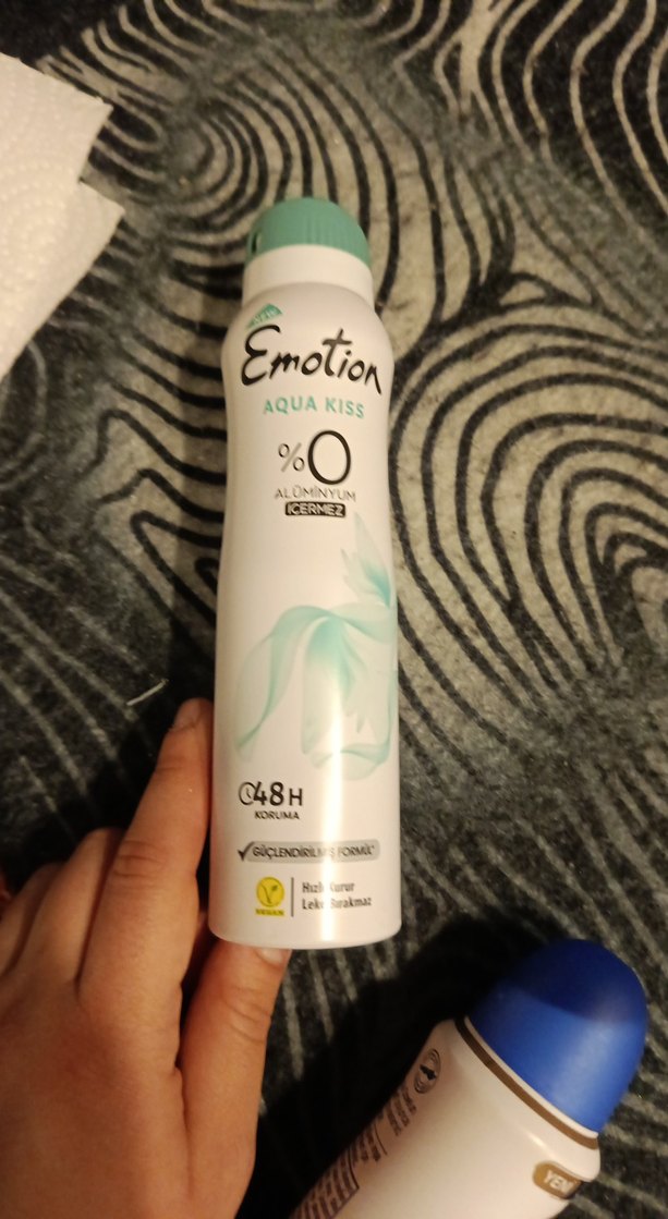 Emotion Aqua Kiss kadın deodorant, 48 saat koruma sağlar, ferah bir kokuya ve %0 alkol içerir.