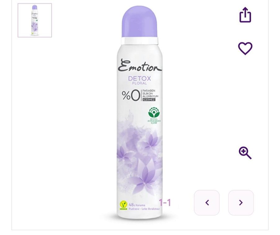 Emotion Detox Floral kadın deodorant, 48 saat koruma sağlar, paraben, silikon ve alüminyum içermez. Lekesiz ve hafif çiçek kokuludur. toplu alımda 100 TL tane