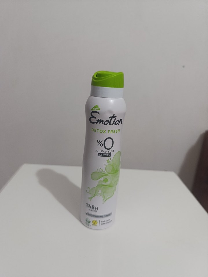Emotion Detox Fresh kadın deodorant, %0 alüminyum içermez ve 48 saat ferahlık sağlar. Yeşil kapaklı şişe tasarımına sahiptir.
