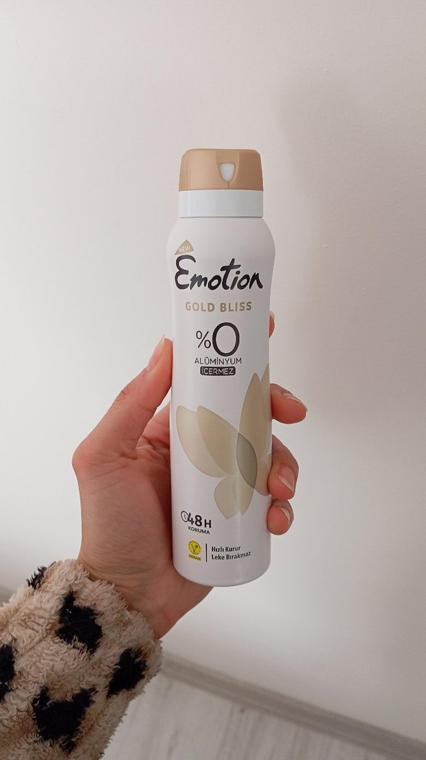 Emotion Gold Bliss kadın deodorant, alüminyum içermeyen formülüyle 48 saat koruma sağlar. Leke bırakmaz ve ferahlık sunar. SIFIR ÜRÜN