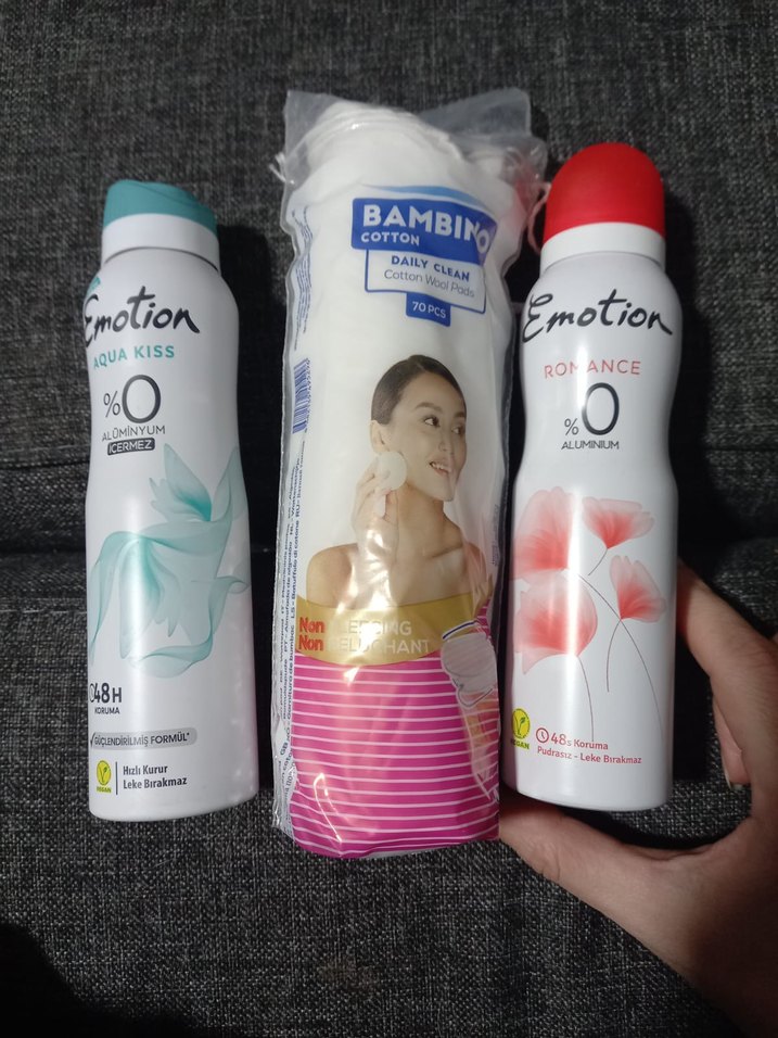 2 adet Emotion markalı kadın deodorant %0 alüminyum Aqua Kiss ve Romance kokularında + Bambino pamuk günlük oje ve makyaj temizleme pedleri ile birlikte fiyat üçlü. Farklı çeşitleri için sayfama bakabilirsiniz.