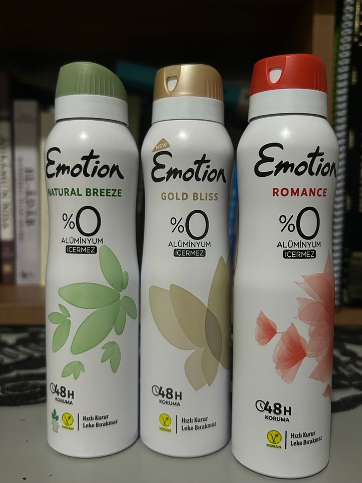 Emotion kadın deodorantları Natural Breeze, Gold Bliss ve Romance kokularıyla 48 saat koruma sağlar. Alüminyum içermez, cildi kuru tutar ve leke bırakmaz.
