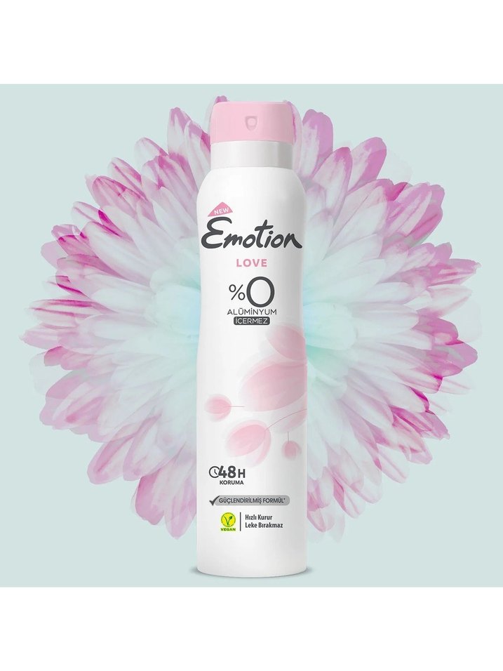 Emotion Love kadın deodorant, %0 alüminyum içermeyen formülü ve 48 saat korumasıyla ferah bir koku sunar.