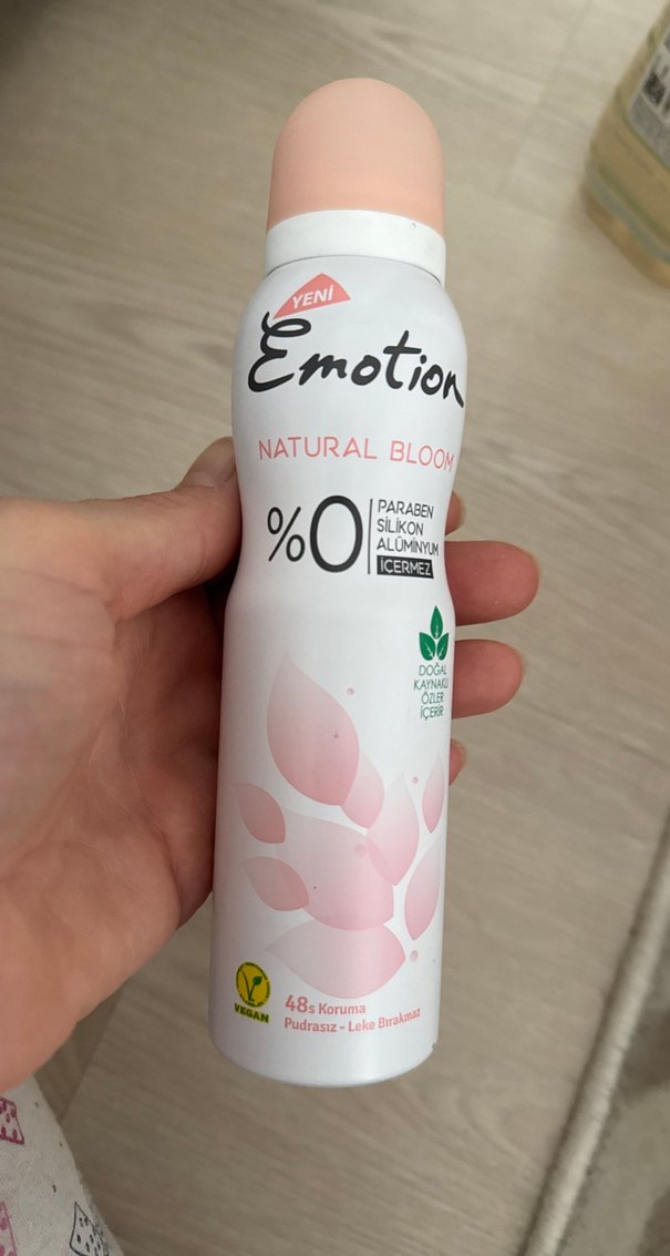 Emotion Natural Bloom deodorant, paraben, silikon ve alüminyum içermez. 48 saat koruma sağlar, vegan ve lekesizdir.