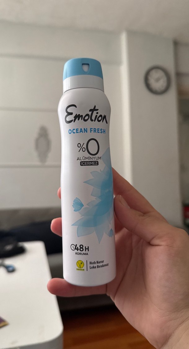 Emotion Ocean Fresh deodorant, alüminyum içermez ve 48 saat koruma sağlar. Terlemeyi önler ve leke yapmaz. Ferah bir kokuya sahiptir. KAdın deodorant sıfır