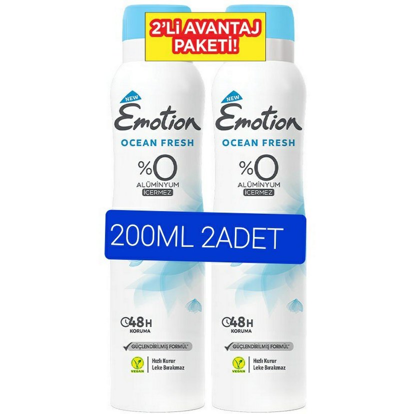 Emotion Ocean Fresh kadın deodorant, alüminyum içermeyen formülüyle 48 saat koruma sağlar. Hızlı kurur, leke bırakmaz. 2x200ml avantaj paketi. ürünler kesinlikle sıfır kullanılmadı