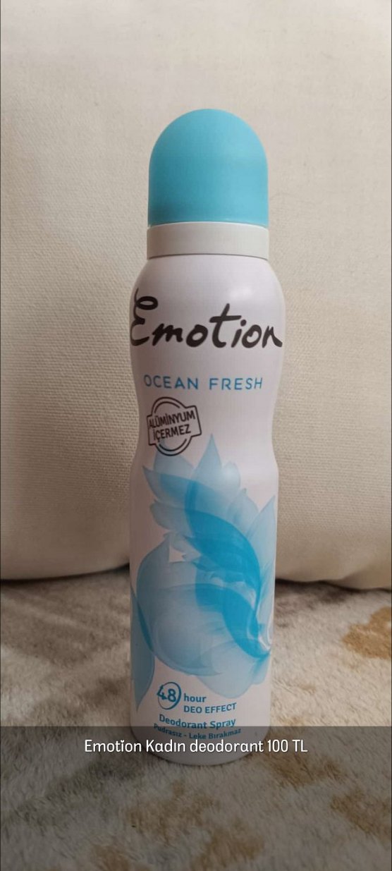 Emotion Ocean Fresh kadın deodorant, alüminyum içermez ve 48 saate kadar ferahlık sağlar. Temiz, okyanus esintili koku sunar. Kullanılmadı doludur