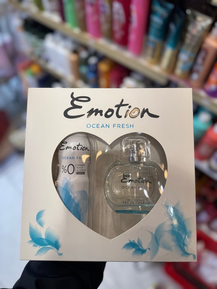 Emotion Ocean Fresh set, ferah okyanus kokusuna sahip deodorant ve parfüm içerir. Deodorant %0 alkol oranıyla sunulmaktadır.