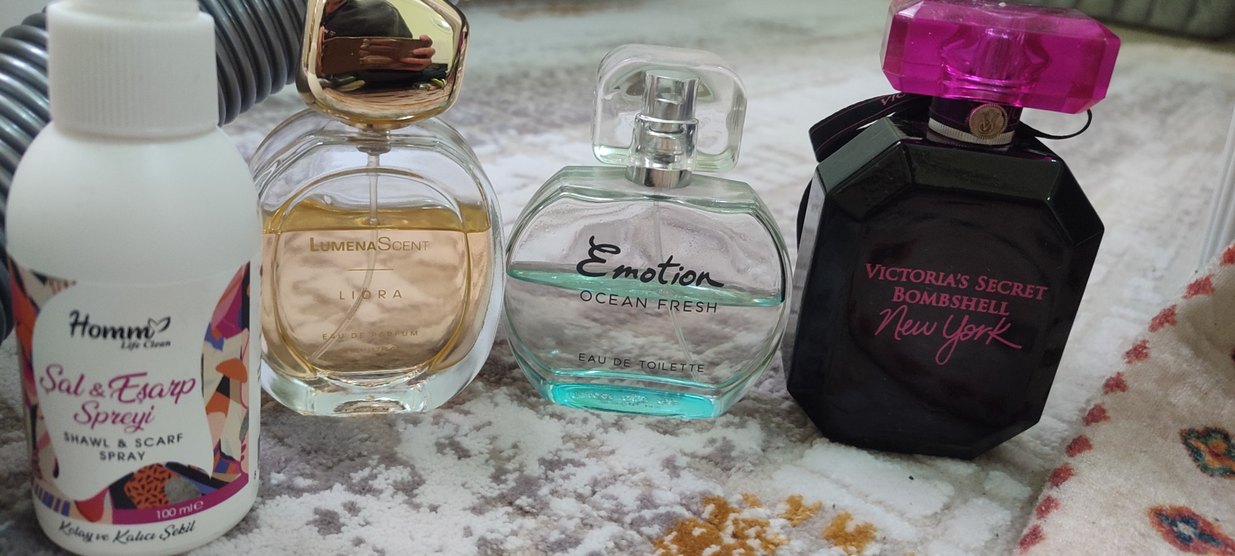 ürünlerimin çoğu yeni gibidir. sadece yarısı doludur diyebilirim. üç adet parfüm ve bir adet şal eşarp spreyi. ütü yaparken kullanılır. dört ürünü çok uyguna koydum.