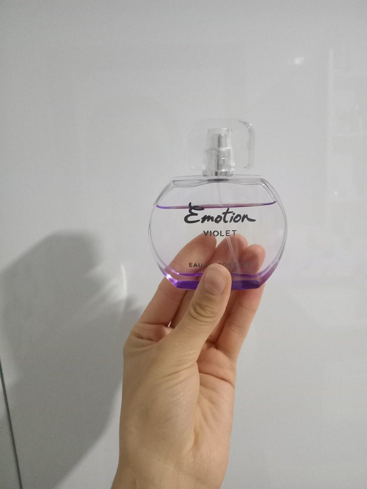 Emotion Violet kadın parfümü, mor detaylı şeffaf şişede. Ferah ve çiçeksi bir koku sunar.