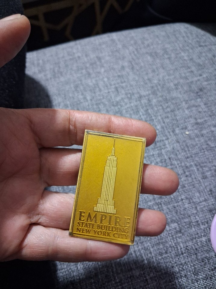 Parlak altın renkte, Empire State Binası figürlü vintage tarzda bir rozet. Klasik ve eski moda bir görünüm sunar. ️