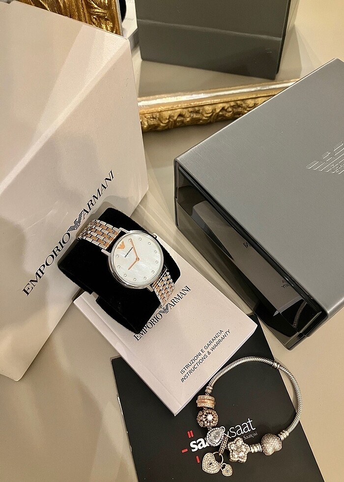 Garanti belgesi kutuları kitapçığı her şeyi mevcuttur. Tam takım şeklinde göndereceğim. Gümüş rose gold renklerde. İçi sedefli ve swarovski taşlı. Efsane bir saat 15bin tl güncel fiyatı. Pili bitmiş. Pil taktırıp kullanabilirsiniz.