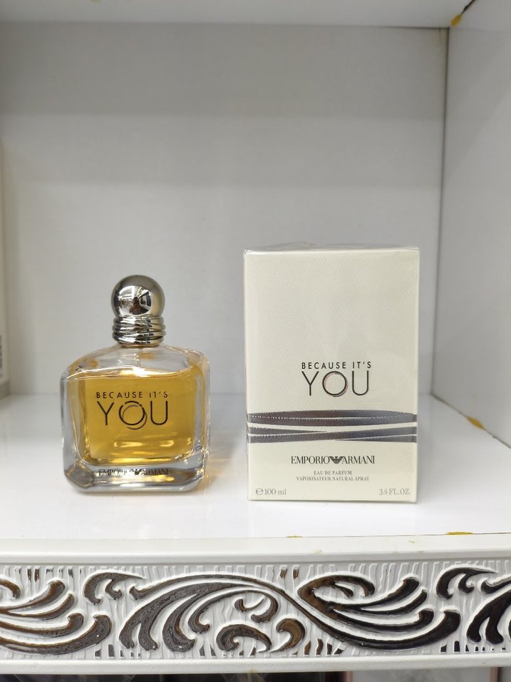 Emporio Armani Because It's You, çağdaş ve gösterişli tarzda erkek parfümü. Bej şişesi ve gri detaylarıyla şık bir görünüm sunar.