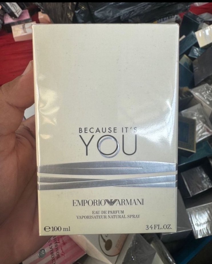 Emporio Armani Because It's You, 100ml parfümü, bohem ve Paris tarzı ile. Bej ve gri kutuda, doğal sprey başlık içerir.