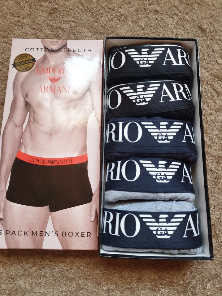 Bu set, baskılı Emporio Armani logolu, kısa kesim ve esnek pamuklu kumaştan yapılmış 5 adet erkek boxer içerir. Koyu renkler ve dar kesim özelliklidir.