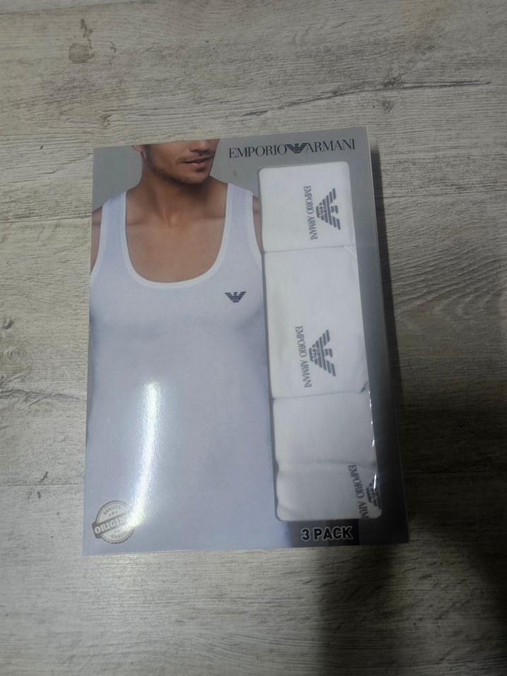 Emporio Armani'den üçlü, baskılı logolu, beyaz, kısa boy ve vücuda oturan erkek atlet seti. Athleisure tarzına uygundur.