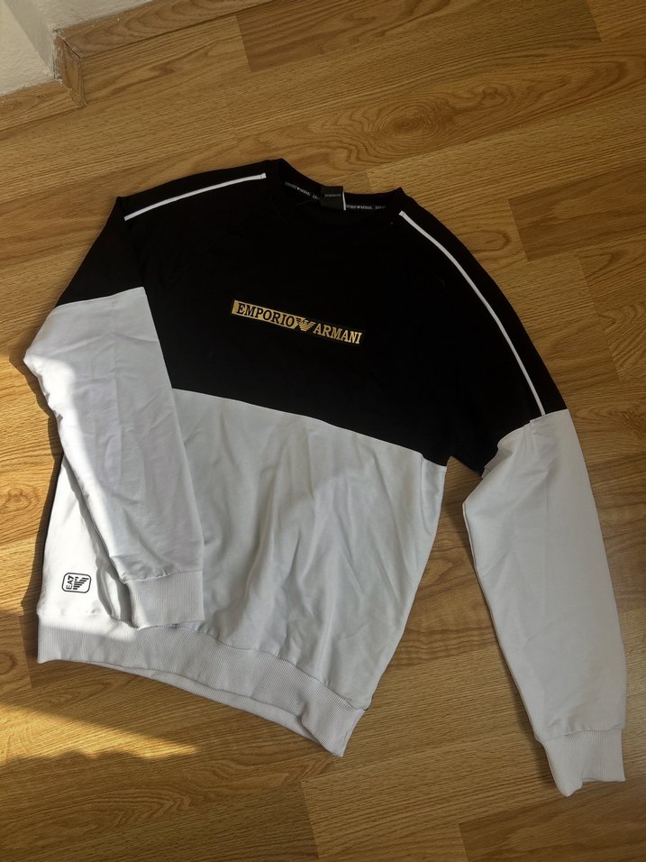 Emporio Armani sweatshirt, yuvarlak yaka ve uzun kollu, rahat kesim. Siyah beyaz baskılı tasarım, yumuşak kumaşla günlük şıklık sunar.