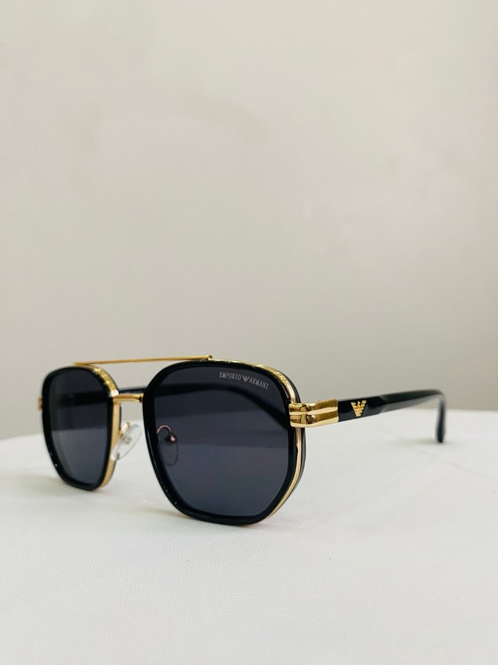 Erkek güneş gözlüğü, parlak altın çerçeve ve koyu camlarla modern klasik tarzı ve klasik zarafeti birleştirir.