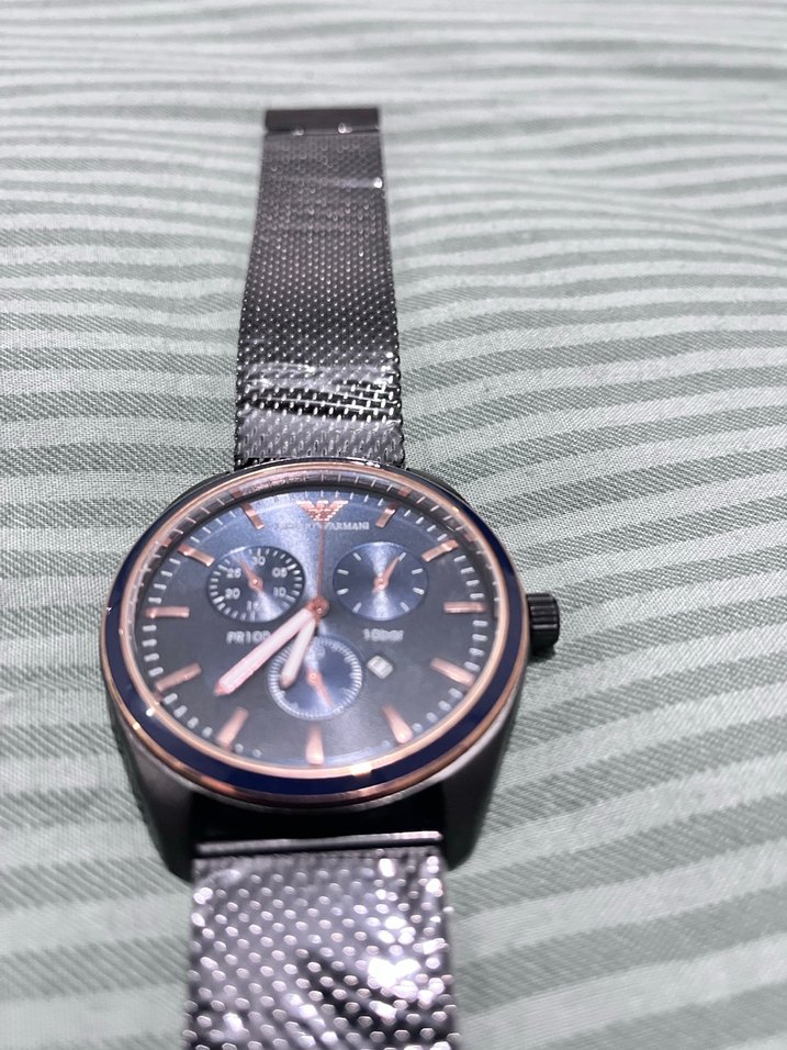 Emporio Armani tarzı erkek kol saati • Yeni, hiç kullanılmamış (sıfır) ürün • Çelik kasa ve metal hasır kordon • Takvim göstergesi, kronograf tasarım • Mavi kadran, gold detaylar • Su geçirmezlik: 50 metre