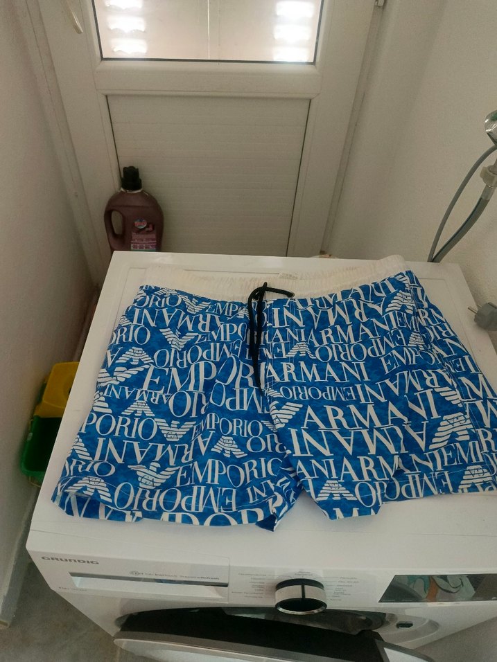 Emporio Armani markalı, renkli mavi baskılı, kısa ve vücuda oturan erkek deniz şortu.