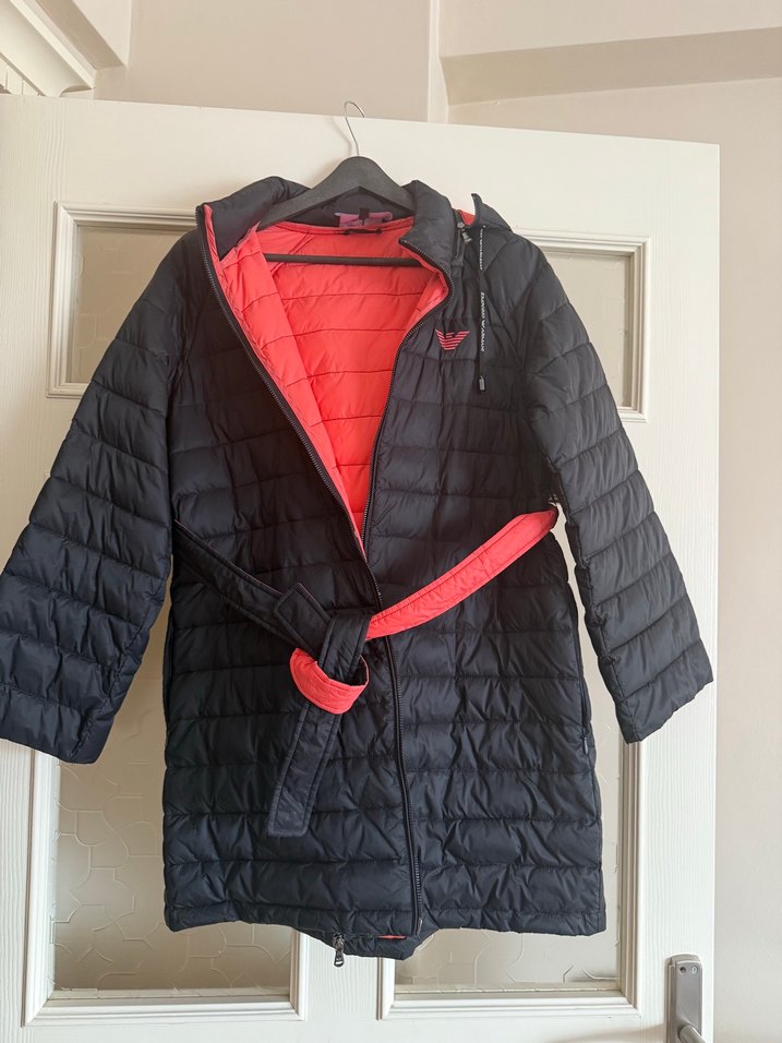 Ürün orijinal marka sadece 1 kez kullanıldı temiz defosuz Su itici özellikli uzun kesim kapitone kemer detaylı kışlık somon -siyah renkli spor şık ürün 42 beden boy 82 iki omuz arası 40 cm Üründe orijinallik kodu mevcut Sıcak tutan bir kumaşı var